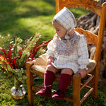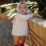 Conjunto de bebé niña con vestido de cuadros y detalles florales, perteneciente a la colección Cocote x Charanga. Una propuesta elegante y cómoda para celebraciones y momentos especiales. El diseño combina un estampado atemporal con delicados volantes y lazos, logrando un estilo clásico y dulce.