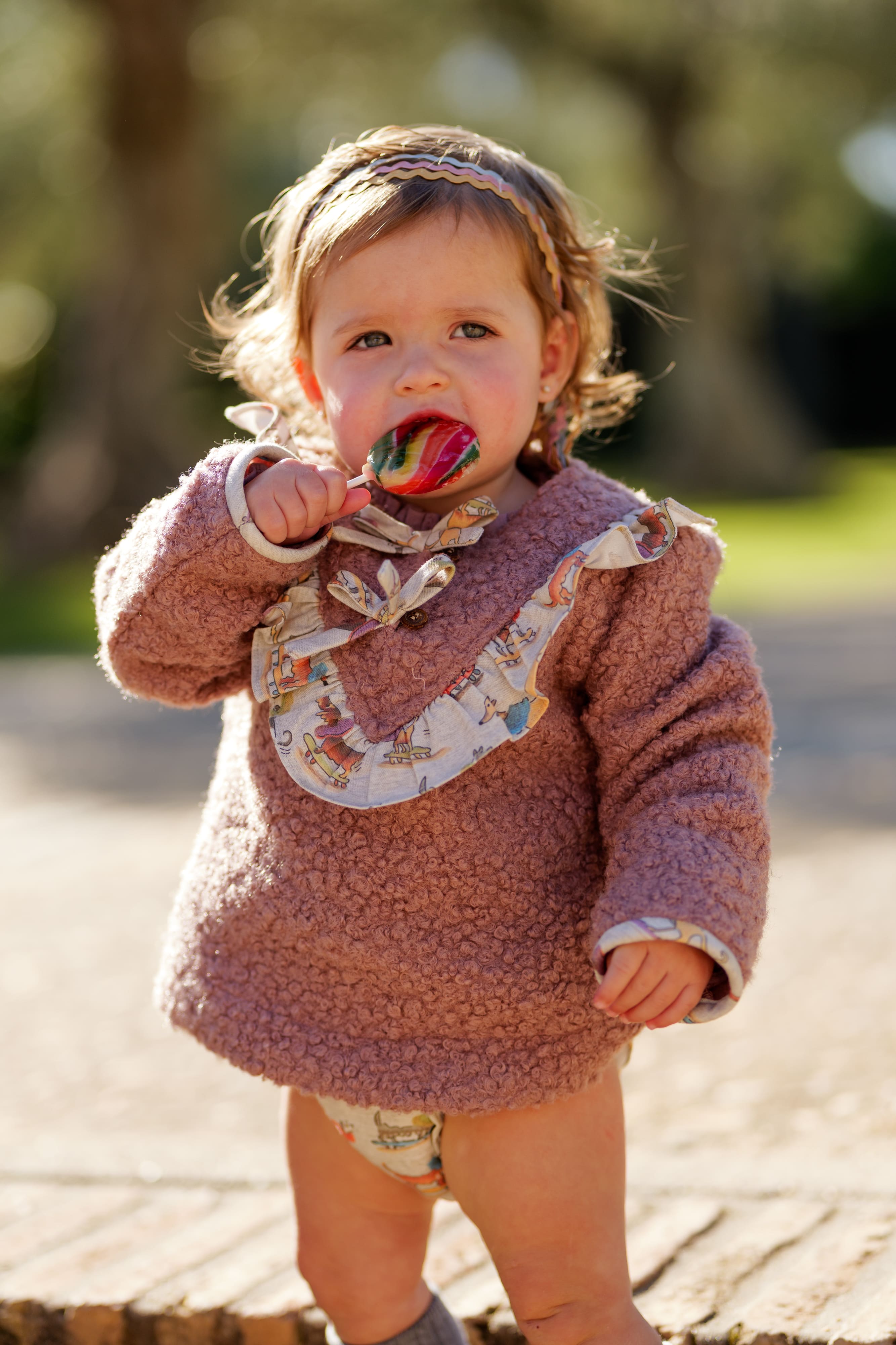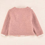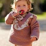 Jersey de bebé niña en color burdeos, confeccionado en tejido cálido y suave tipo borreguito, perfecto para los días fríos. Presenta un diseño delicado con volante estampado en el escote, detalle de lazo decorativo y acabado con contraste en los puños. Una prenda confortable y elegante que combina fácilmente con ranitas, braguitas o pantalones de la colección.