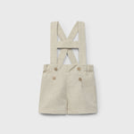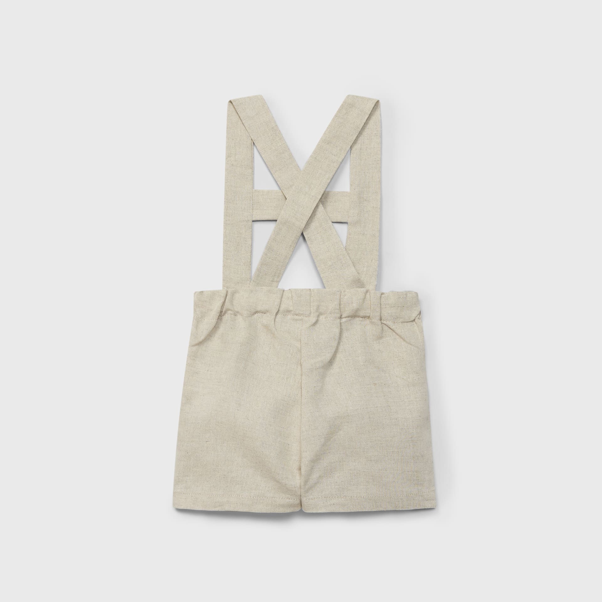 Peto corto beige de lino para recién nacido, con tirantes cruzados en la espalda para un ajuste cómodo. Suave, transpirable y perfecto para días cálidos. Fresco, elegante y versátil.