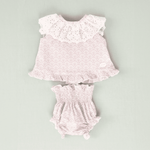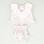 Conjunto bebé niña: vestido sin mangas malva con estampado de abanicos y volante bordado. Braguita cubrepañal con cintura elástica y volantes. Tejido ligero y cómodo. Tallas 3 a 36 meses.