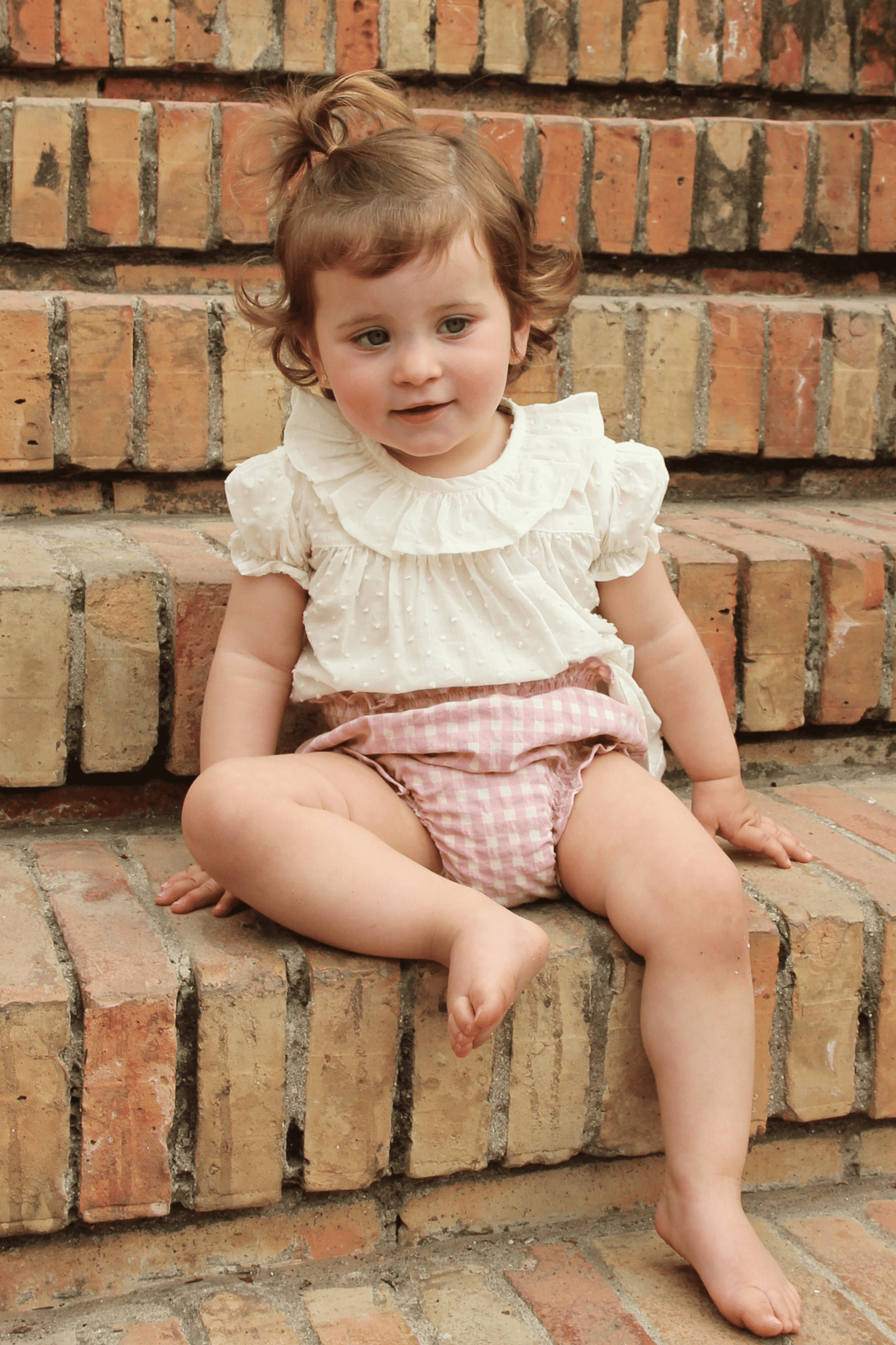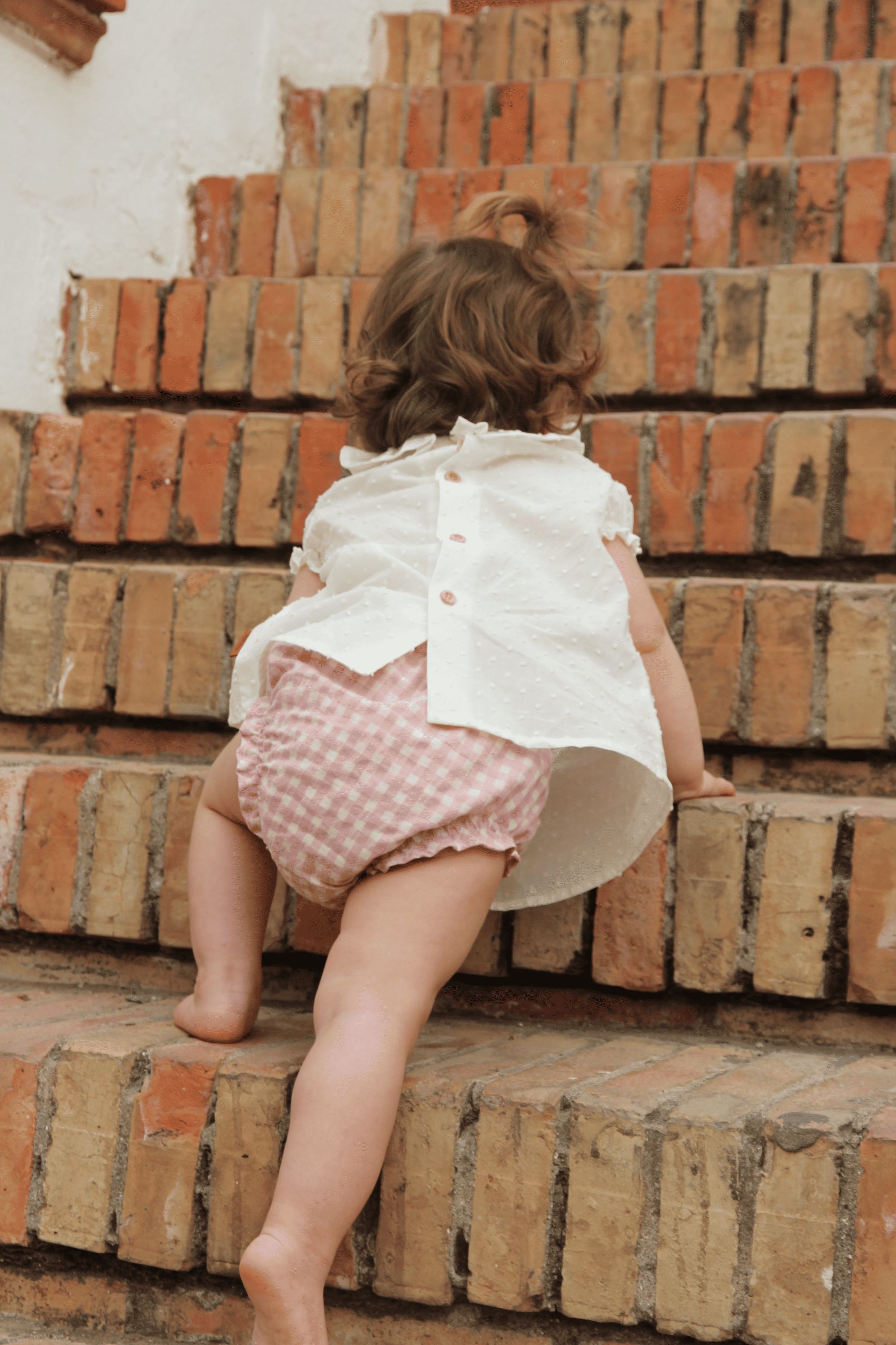La braguita de bebé rosa Cocote & Charanga es una prenda esencial para cualquier pequeña. Confeccionada con un suave tejido de cuadros vichy, esta braquita rosa no solo es cómoda y suave, sino que también brinda un estilo clásico y elegante.