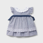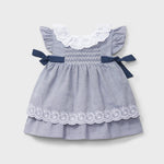 Vestido marino para recién nacida en tejido Oxford suave y resistente. Volante en el cuello y lazos laterales que aportan un toque elegante. Perfecto para ocasiones especiales con máximo confort.