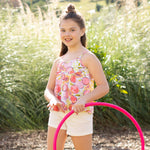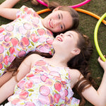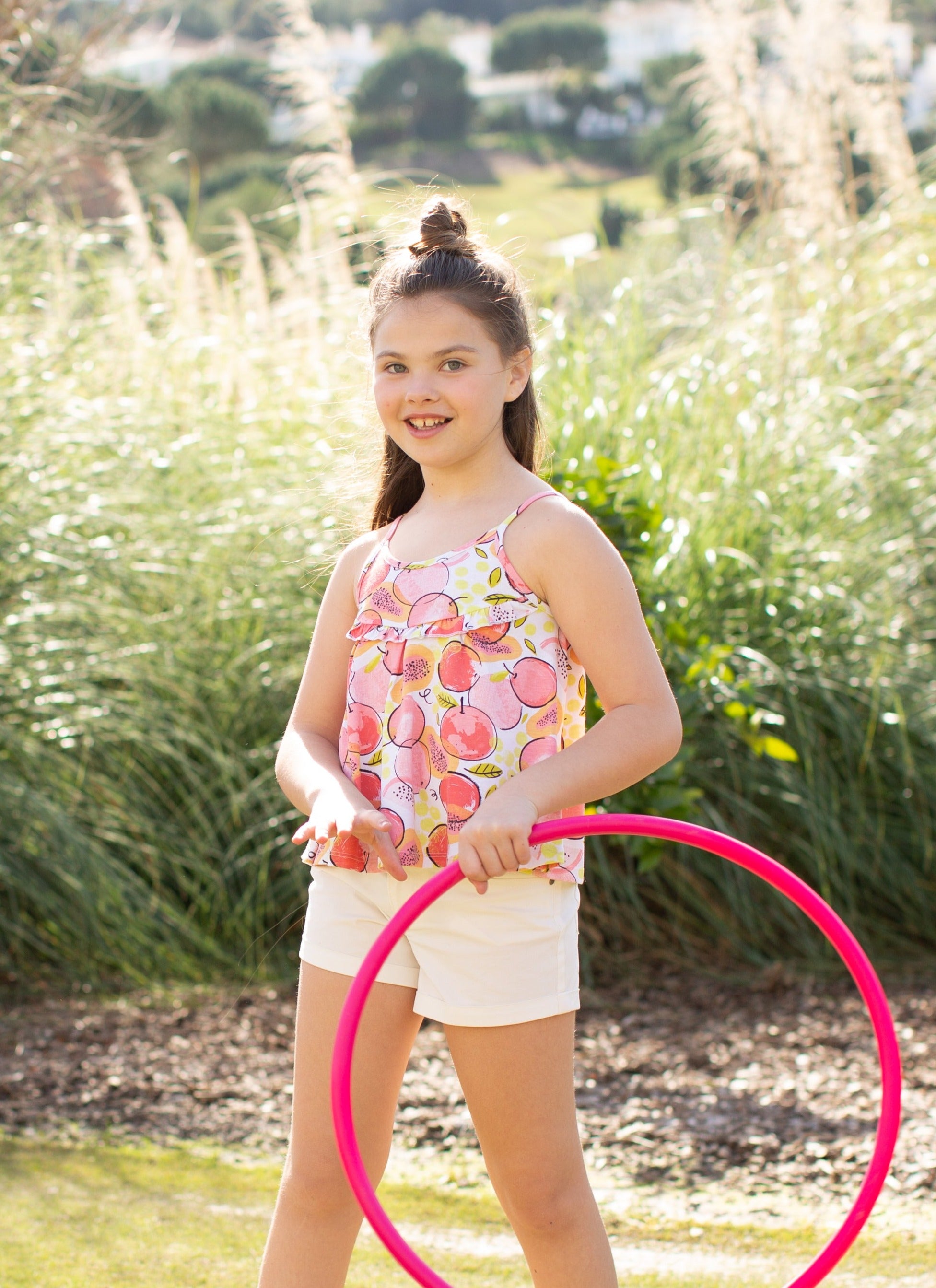 Camiseta de niña en color estampado con manga de tirantes y estampado de melocotones en tonos rojos y amarillos. Modelo Cafruta de la colección Baño con referencia 78343-298 de Charanga, realizado en Punto: 35% Algodón, 65% Poliéster.