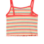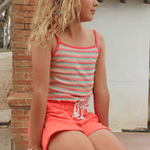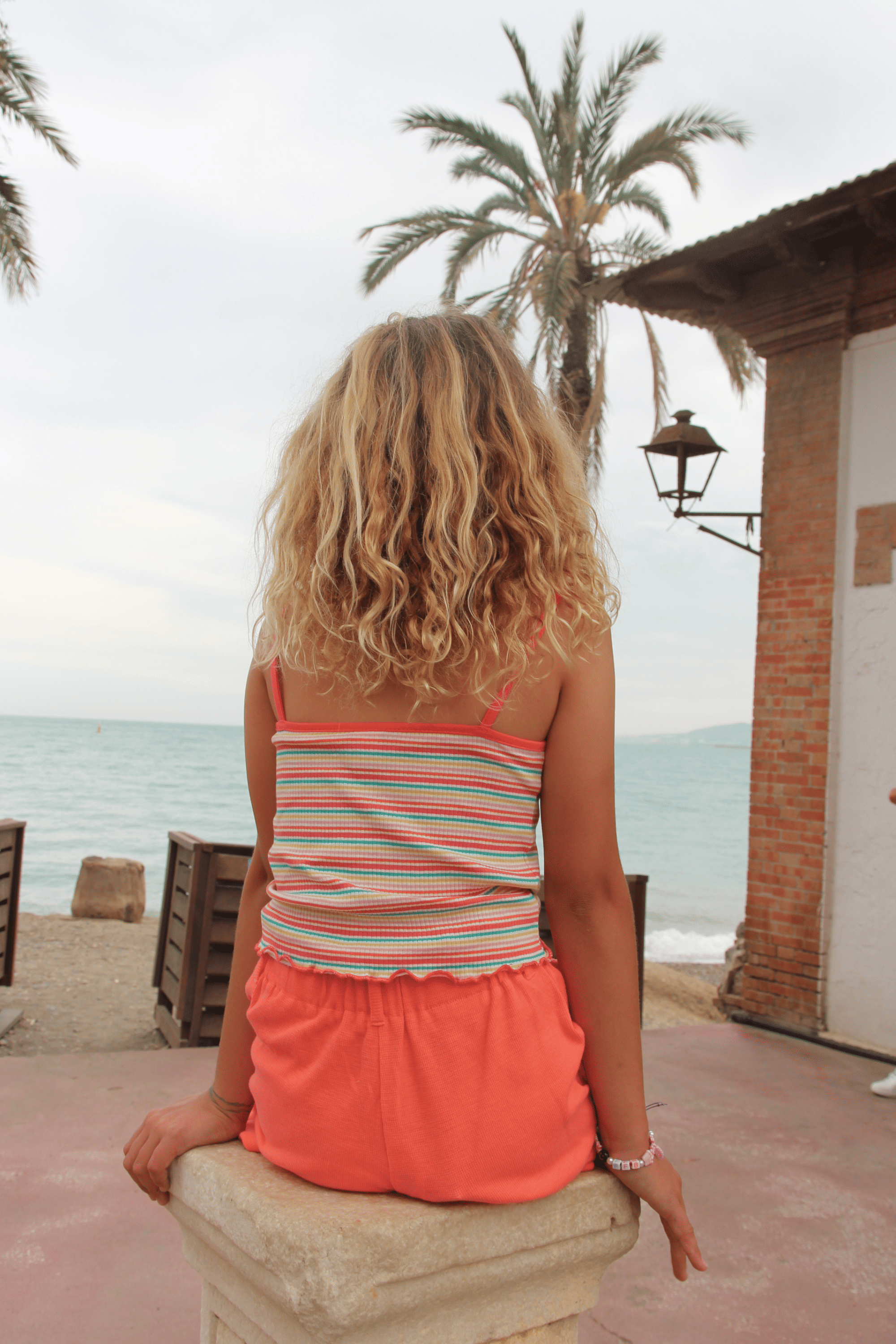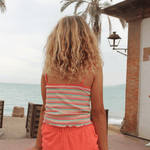 Camiseta de niña en color a rayas con mangas de tirantes. El estilo de la camiseta es top, para que quede a ras de la cintura. Modelo realizado en Punto: 97% Algodón, 3% Elastano (Lycra).
