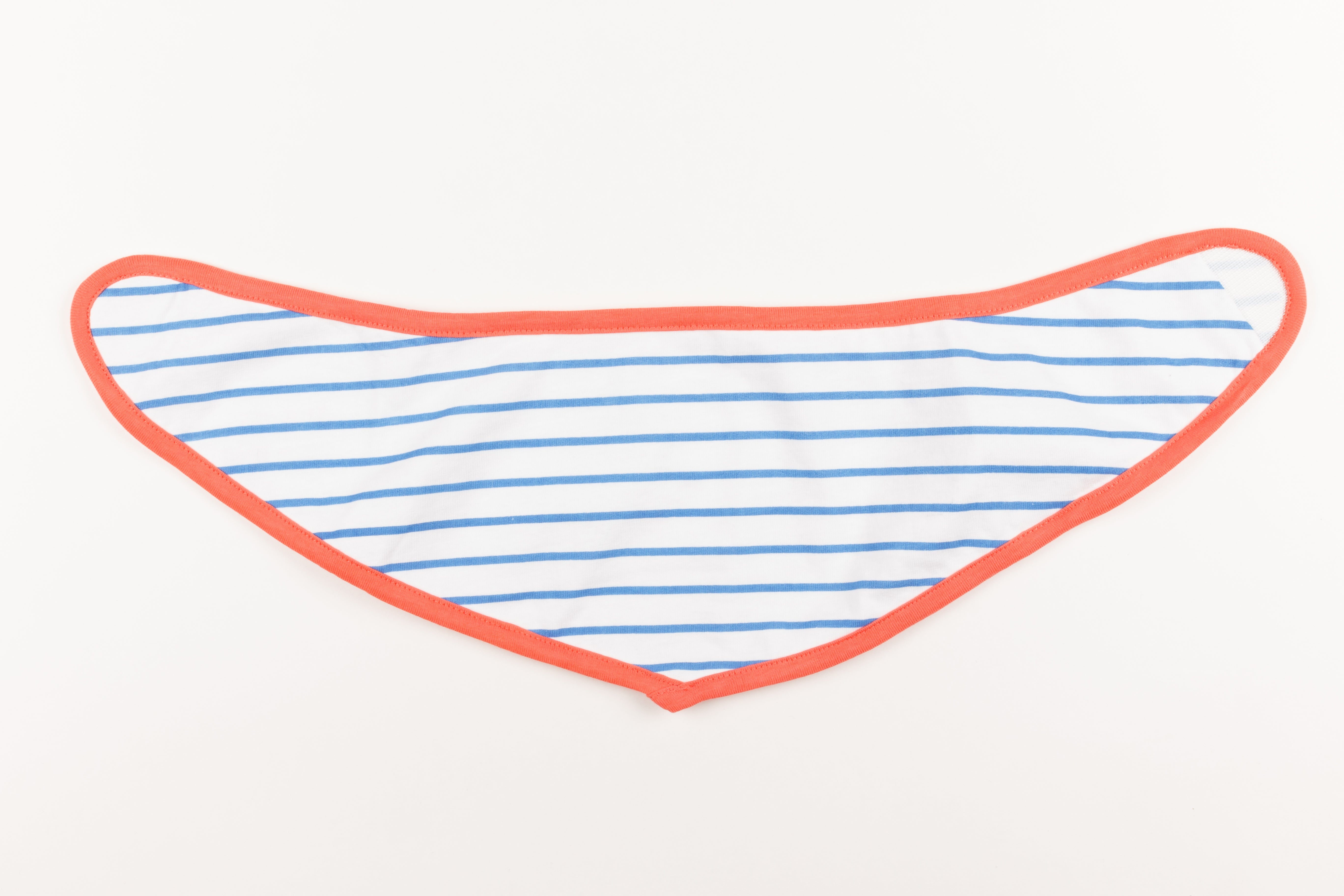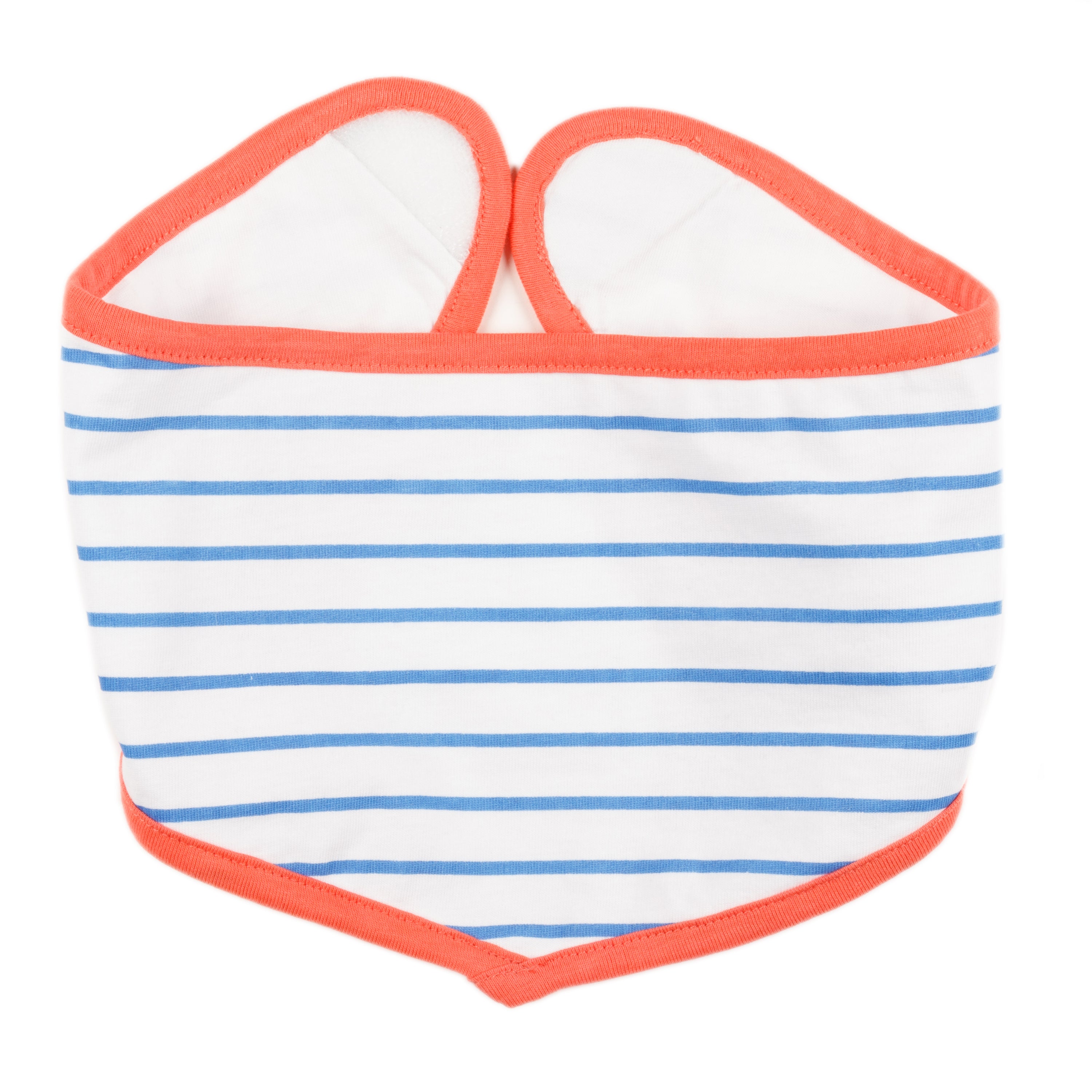 Este babero tipo bandana combina estilo y practicidad para el día a día del bebé. Su tejido es suave al contacto con la piel y la doble capa ayuda a retener babitas durante la dentición. El vivo coral enmarca el diseño marinero de rayas azul, fácil de combinar con cualquier look. Cierre cómodo para poner y quitar en un instante.