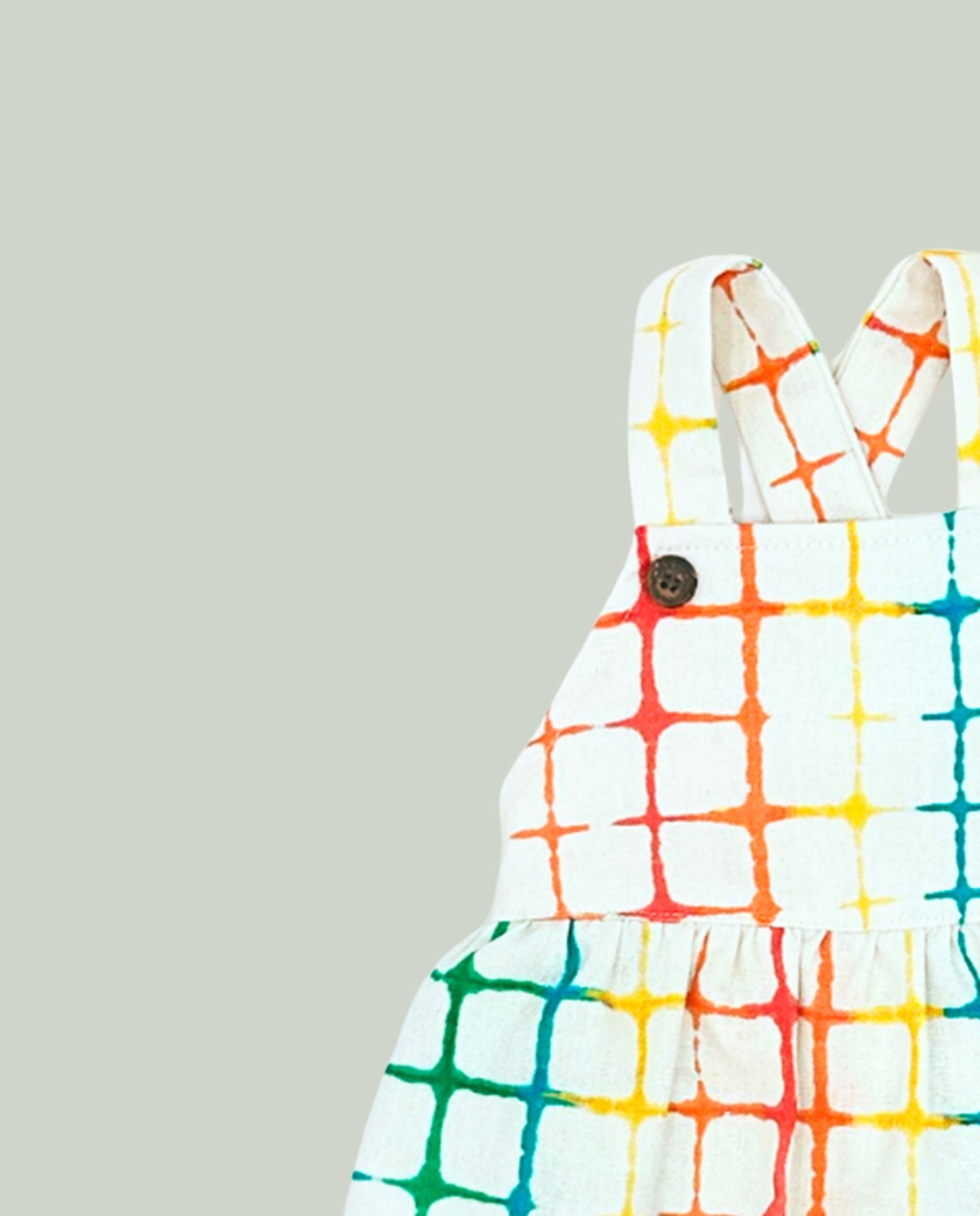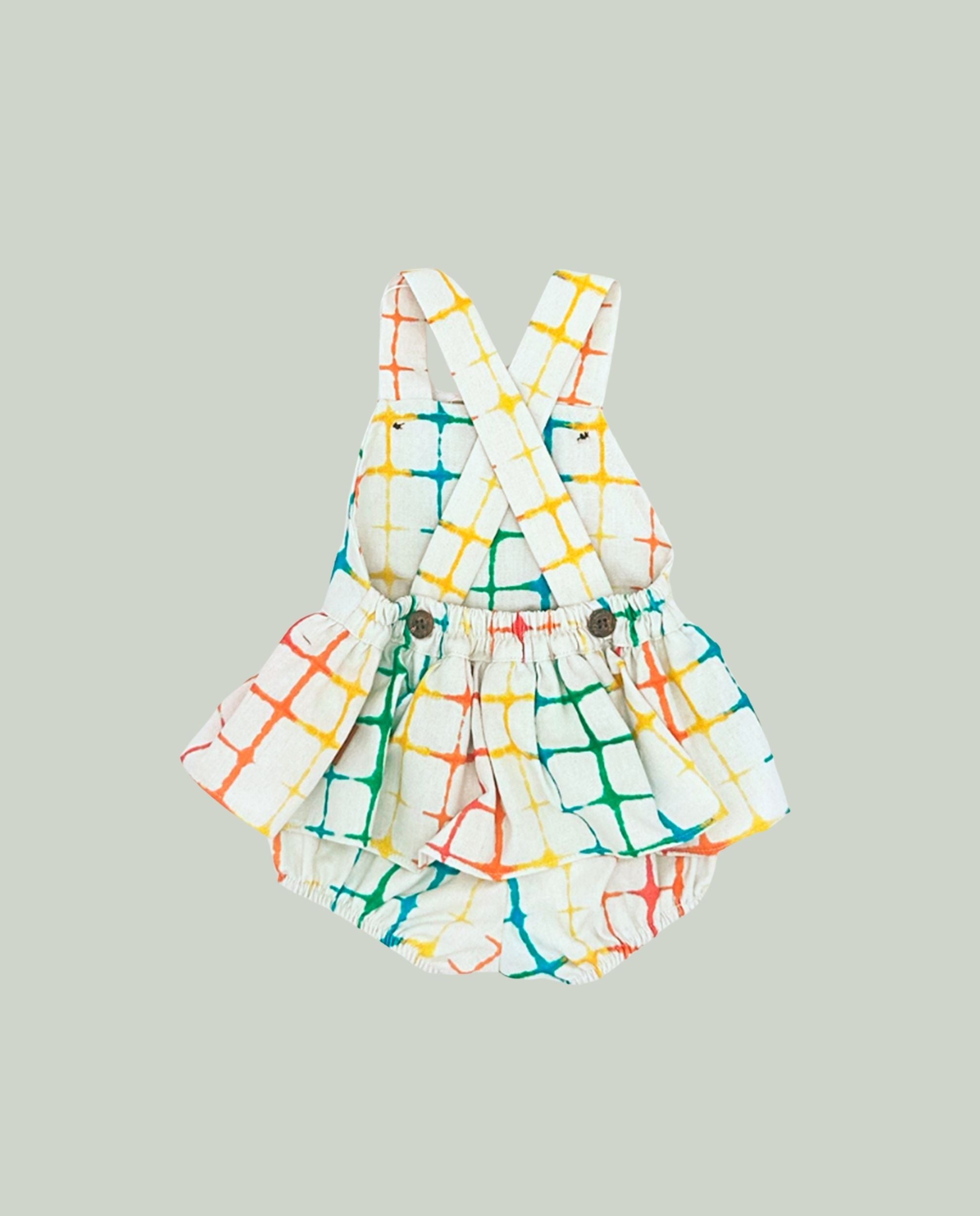 Braguita peto bebé niña con estampado tie dye multicolor. Volante y perneras elásticas para mayor confort. Tirantes cruzados en espalda para ajuste seguro. Algodón suave y transpirable. Tallas 3 a 24 meses.