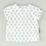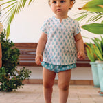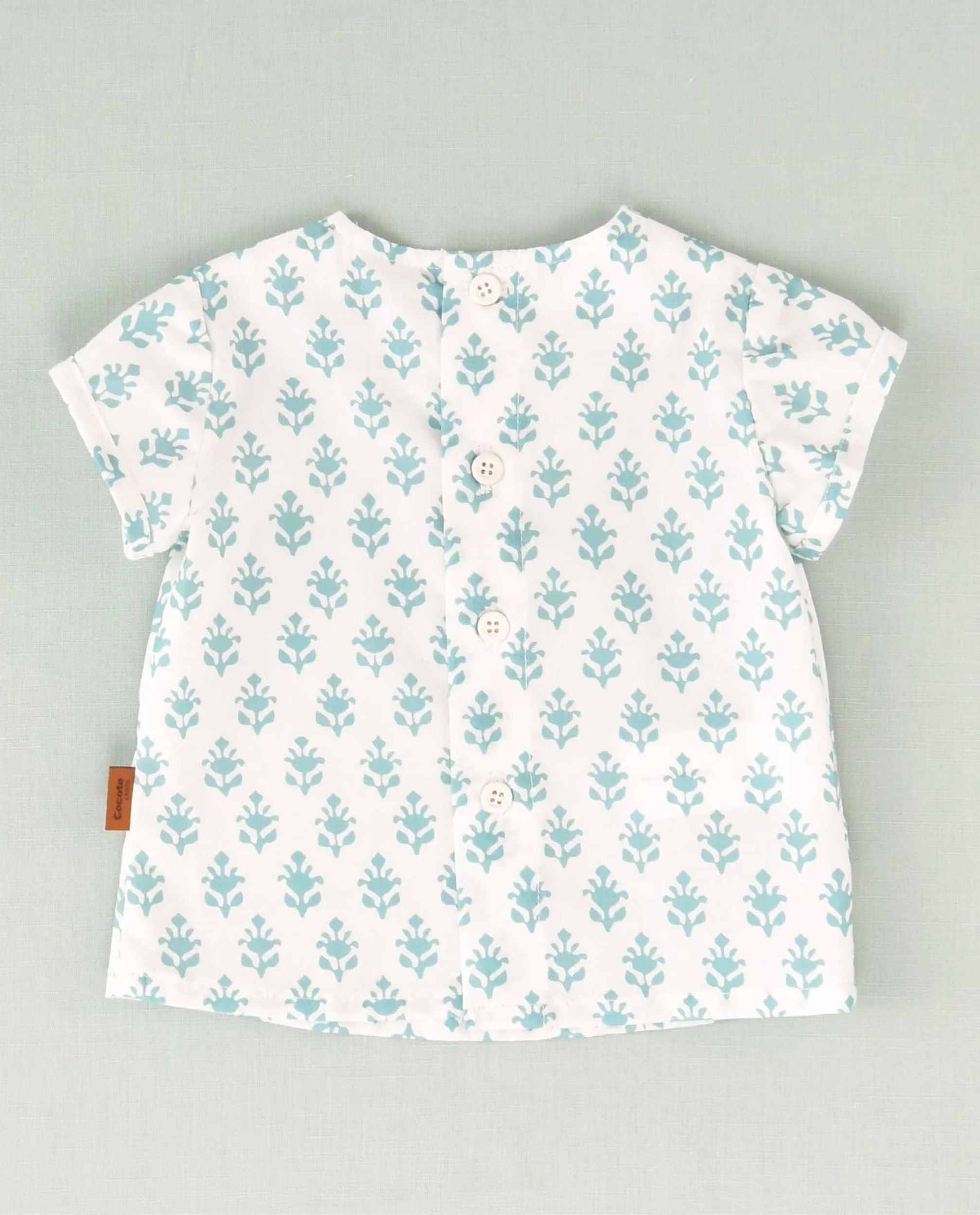 Camisa de bebé niño con estampado floral en tonos blanco y turquesa. Diseño de cuello de pico y mangas cortas. Confeccionada en tejido suave y ligero, ideal para el verano. Disponible en tallas de 6 a 36 meses.