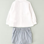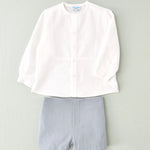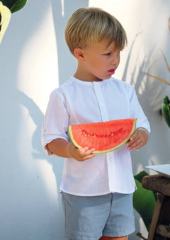 Camisa de niño con rayas multicolor, cuello mao y mangas largas con botón para ajustar. Tejido suave y transpirable, ideal para el verano. Básico cómodo y estiloso. Disponible en tallas de 2 a 6 años.
