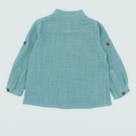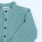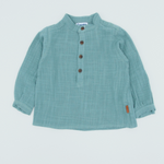Camisa verde niño en lino y algodón, con cuello mao y mangas largas. Tejido transpirable y cómodo. Tallas 2-6 años.