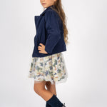 Esta chaqueta tipo biker de niña está confeccionada en punto sudadera suave y confortable. Presenta cremallera cruzada, cuello con solapa, ligero frunce en los hombros y bolsillos laterales. El azul marino combina con todo: vestidos, vaqueros o faldas. Ideal para el día a día y el entretiempo.