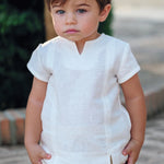 Conjunto de bebé para verano de dos piezas. Blusa blanca de algodón y lino con cuello de pico y manga corta. Cierre en la espalda con botones. Ranita beige a juego con cintura y bajos elásticos. Tejido ligero y transpirable, ideal para los días cálidos. Diseño cómodo y versátil, perfecto para bebés de 3 a 36 meses.