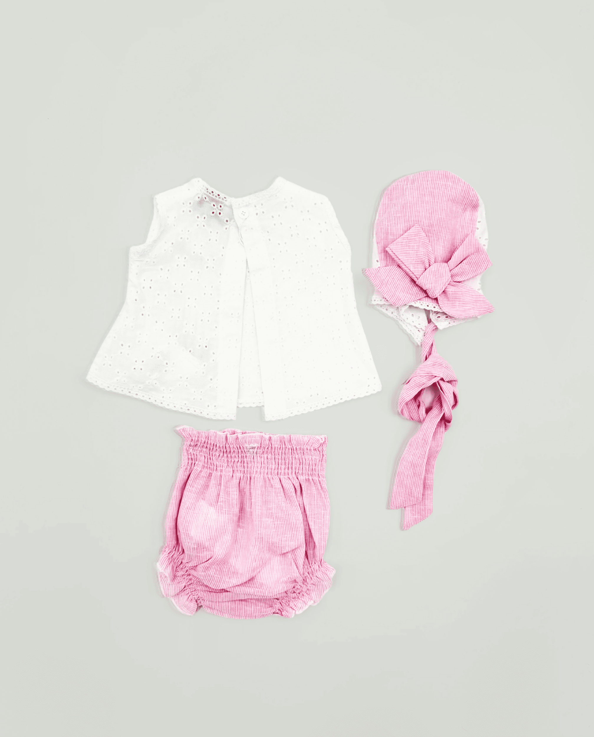 Conjunto perforado para recién nacida, compuesto por vestido, braguita y capota bordados en rosa. Vestido y capota con delicados detalles bordados que aportan elegancia y dulzura. Braguita cómoda con cintura y perneras elásticas para un ajuste perfecto. Ideal para ocasiones especiales. Disponible en tallas de 0 a 6 meses.