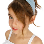 Diadema ancha de tejido efecto denim en azul claro, con nudo decorativo en la parte superior. Lleva zona elástica en la nuca para un ajuste cómodo que no aprieta y se adapta a diferentes contornos.