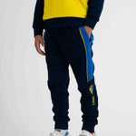 Pantalón deportivo en color azul marino con detalles en amarillo y azul brillante, de la colección Cádiz CF by Charanga. Con un diseño moderno, incluye cintura elástica ajustable y bolsillos laterales con contraste.