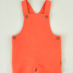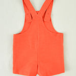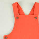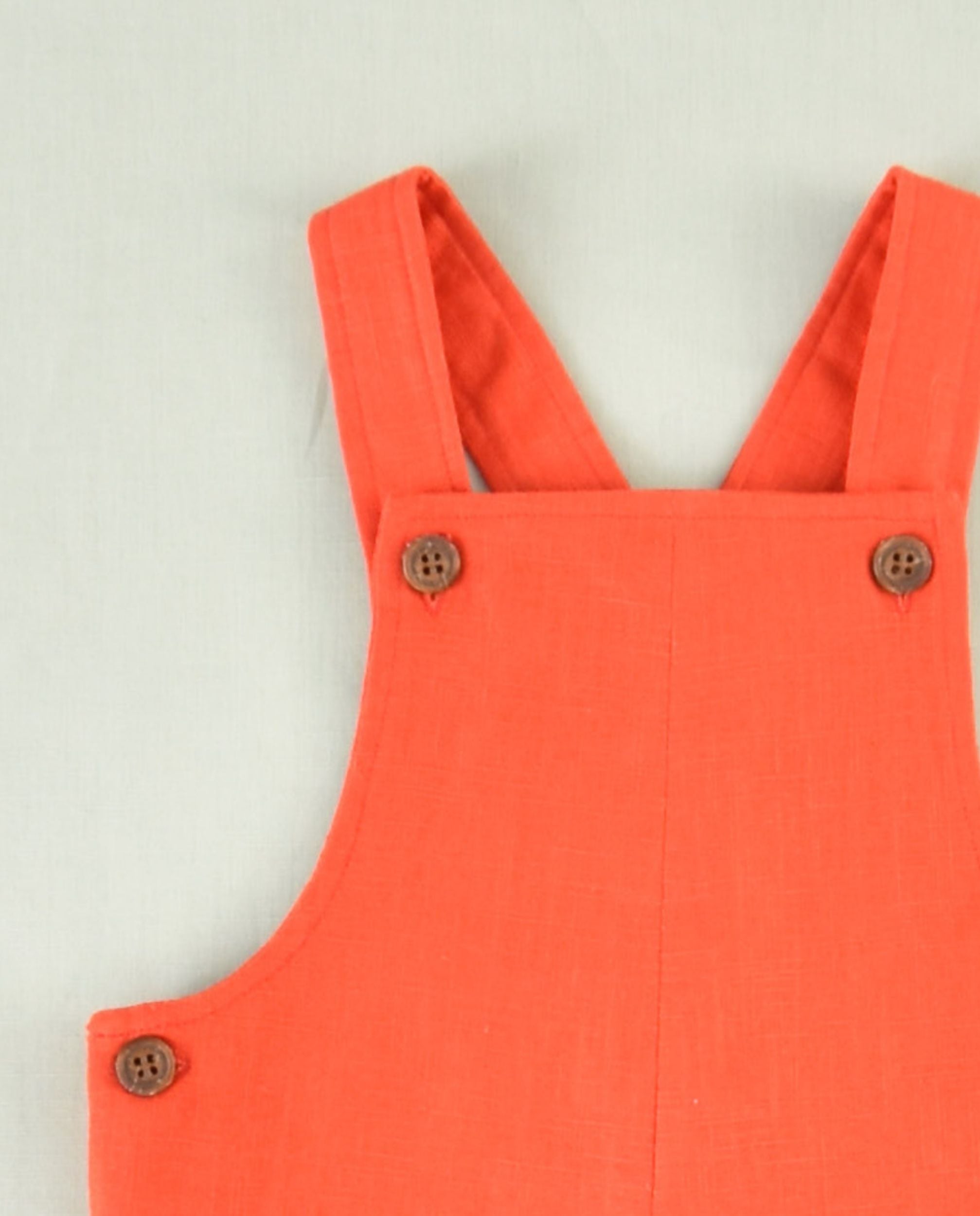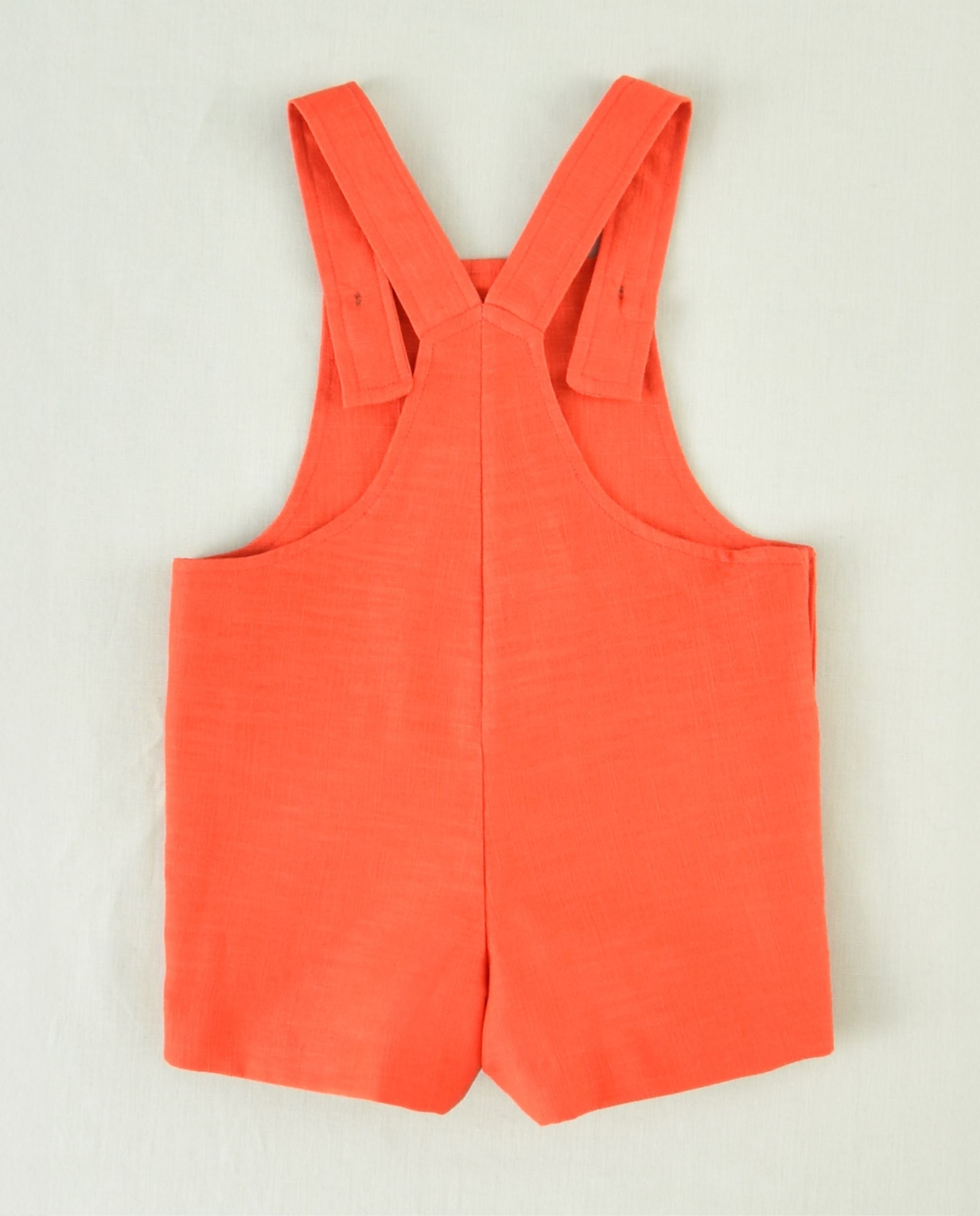 Peto corto de lino coral para niño con tirantes cruzados y botón en la espalda. Diseño ligero y cómodo, perfecto para el verano. Tallas 2 a 4 años.