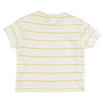 Camiseta de bebé en color amarillo con bolsillo frontal y botones en el hombro. Detalle de aplique en la parte inferior con mensaje `vamos a la playa`. Modelo Cistosa de la colección Special occasion con referencia 79042-240 de Charanga, realizado en Punto: 100% Algodón.