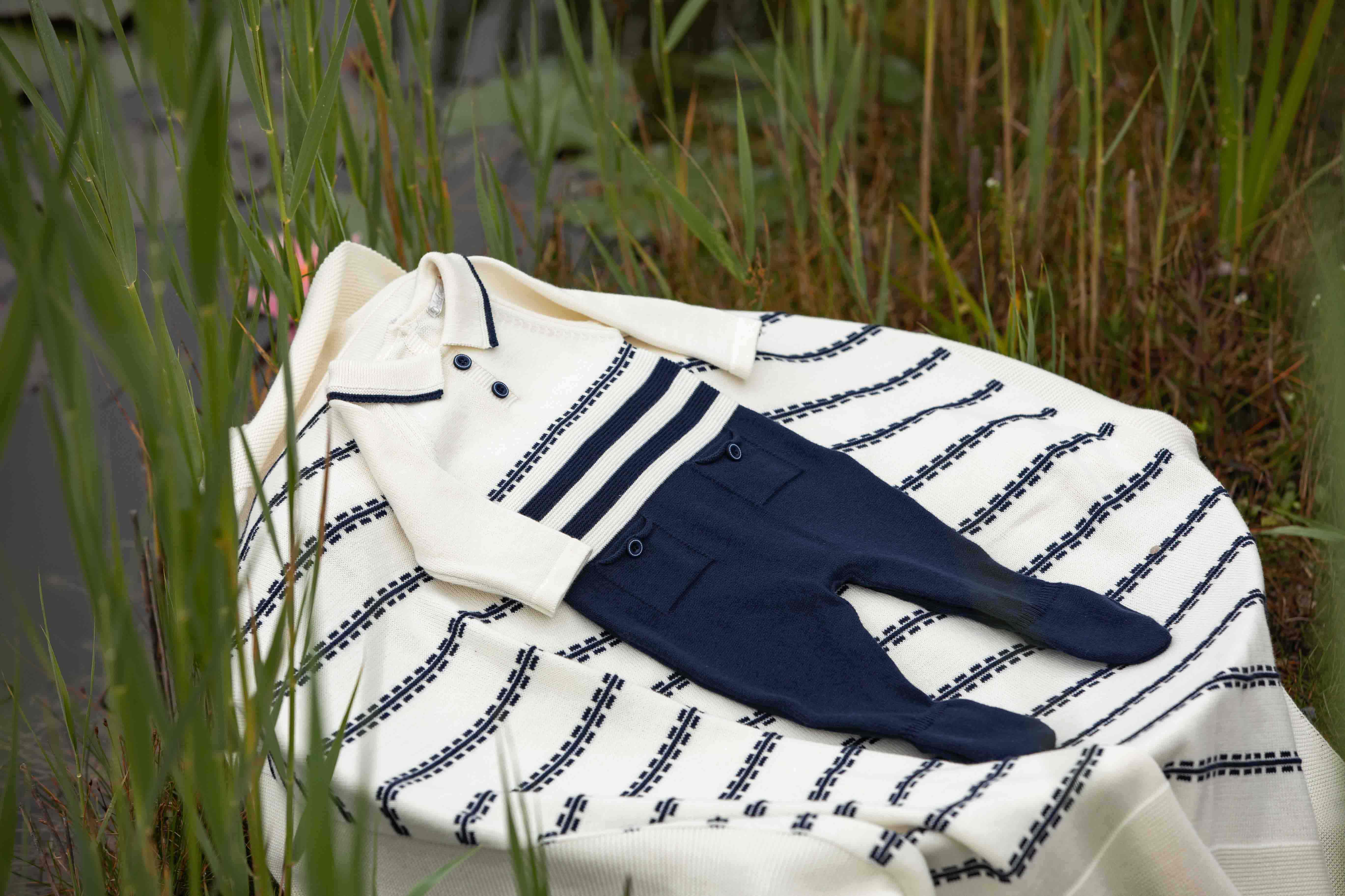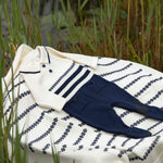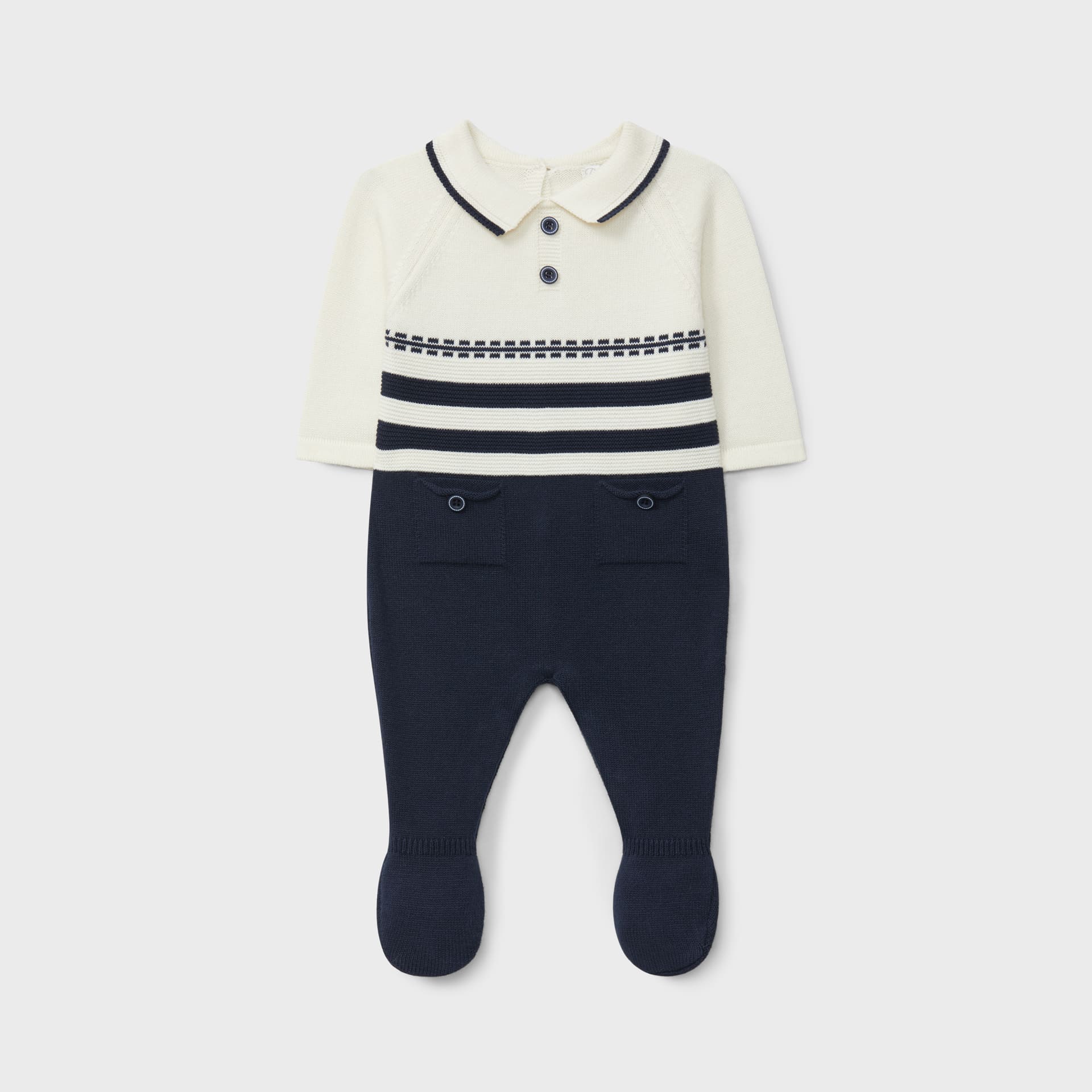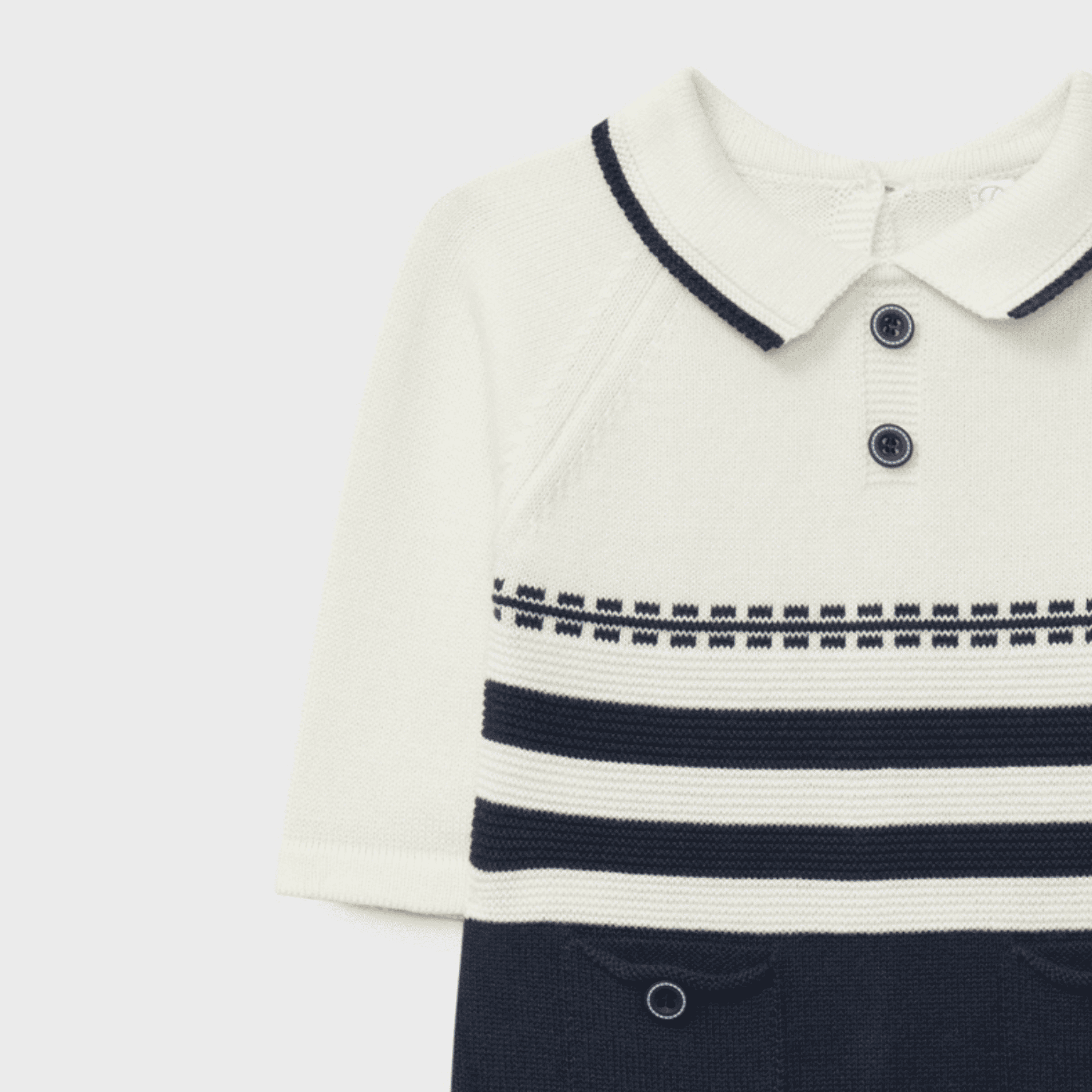Pelele de tricot 100% algodón para recién nacido. Parte inferior en marino y parte superior a rayas crudo y marino. Cuello delicado y botones frontales. Suave, cómodo y elegante para cualquier ocasión.