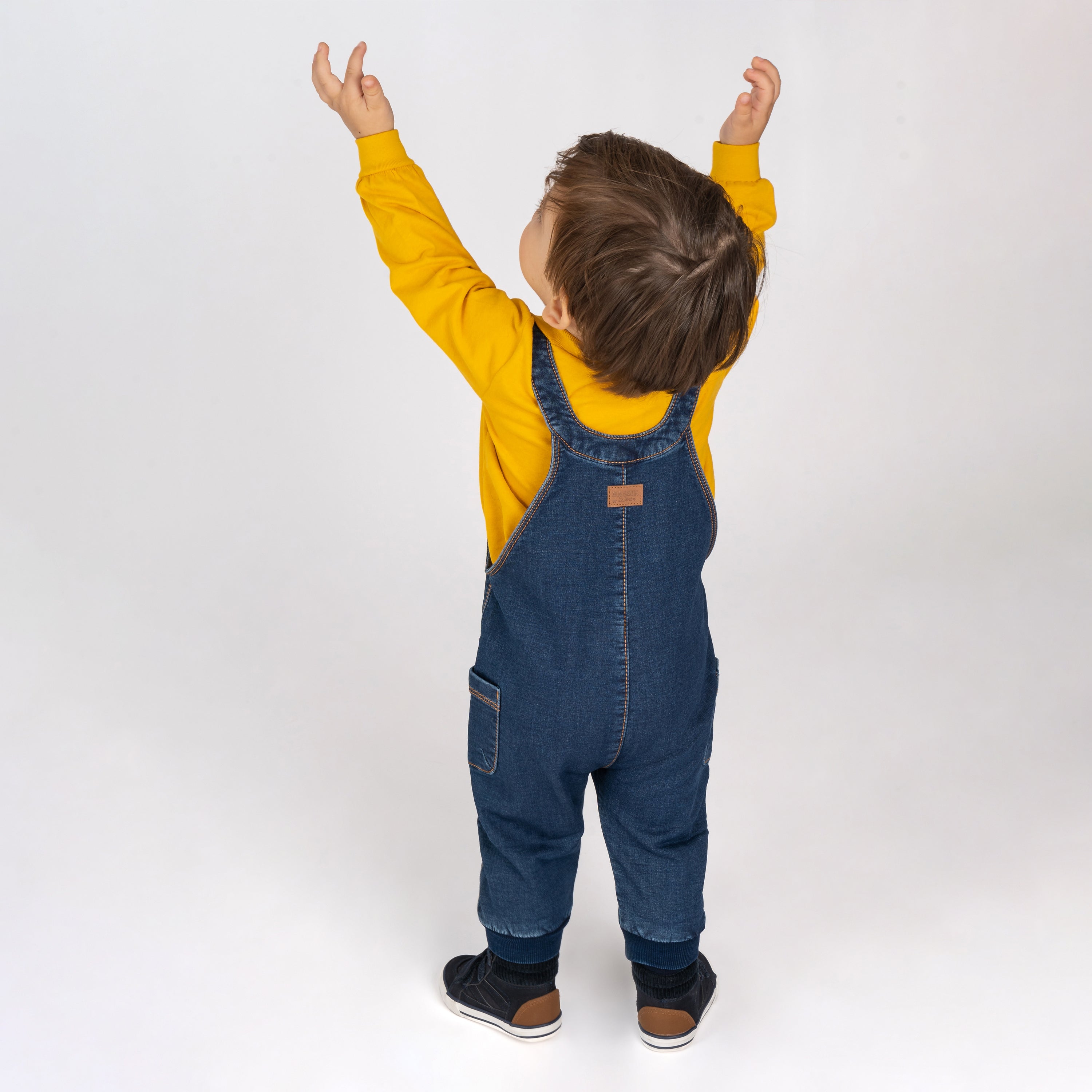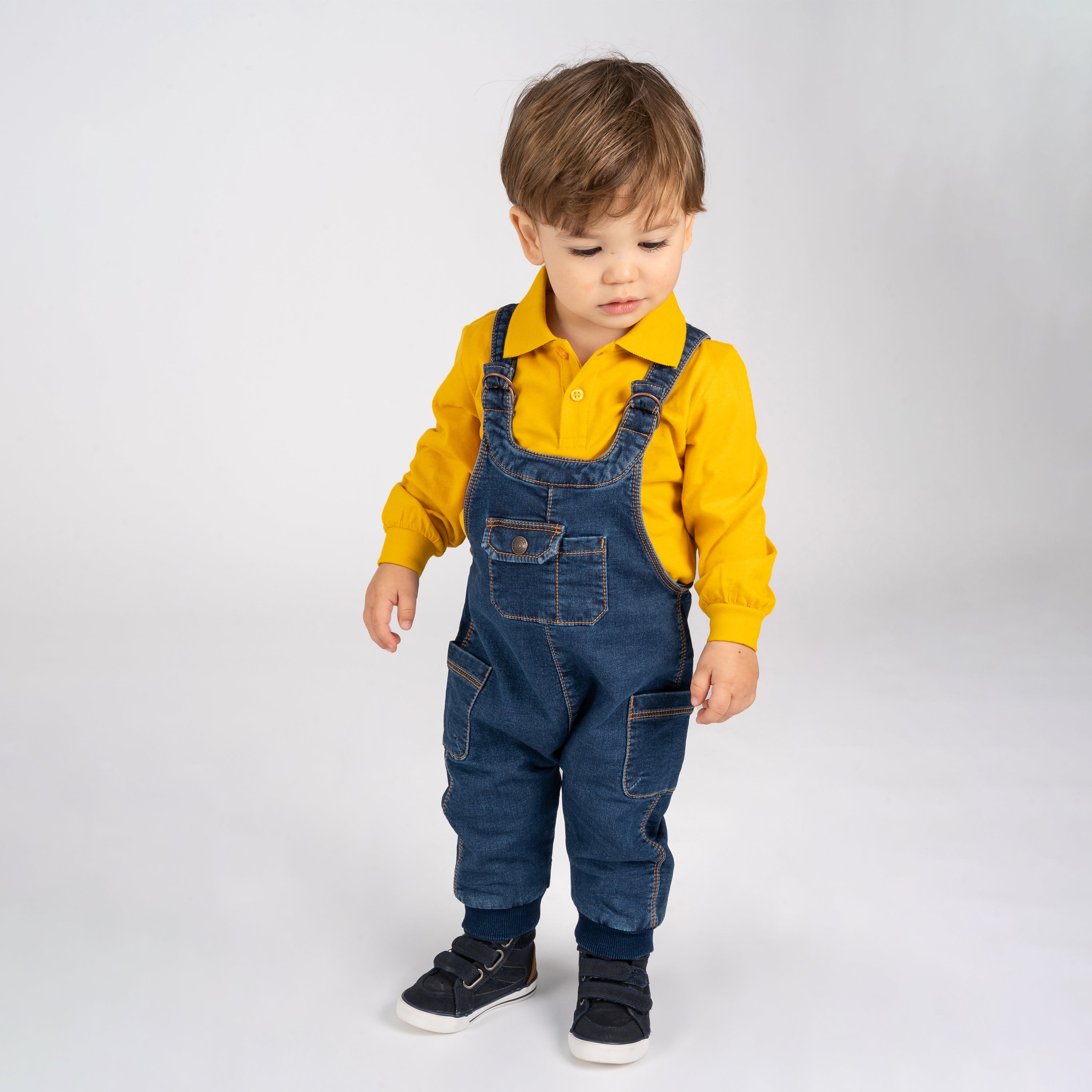 Peto tejano oscuro para bebé, suave y duradero. Con bolsillos laterales y ribetes decorativos, perfecto para combinar en cualquier temporada.
