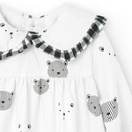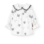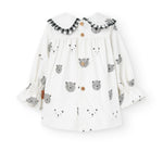 Hermoso vestido de bebé color crudo, una pieza esencial de la colección Cocote y Charanga. Diseñado con un estampado exclusivo y detalles delicados, se adapta perfectamente a la figura de tu bebe para un look moderno y cómodo.